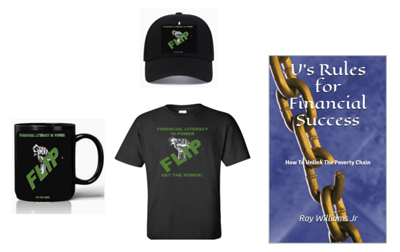 Includes one FLIP t-shirt, one FLIP coffee mug, and one digital copy of U's Rules For Financial Success: How To Unlink The Poverty Chain.
